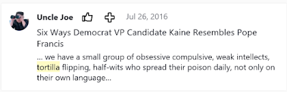 Anthony Principe: "...There is one more thing. A noted commentator once said that it is refreshing simply to take a time out. Discontinue reading, listening and watching the daily news for a limited period. At the end of that time, resume. If you find that your have been renewed and that you didn't and don't really need all the negatively in the daily news, congratulations. Even here at little Gloria we have a small group of obsessive compulsive, weak intellects, tortilla flipping, half-wits who spread their poison daily, not only on their own language side of Gloria, but their mental disease is so overwhelming that they have felt the need to spread their bile on the English board as well (see my profile pic). These miserable intellectual midgets actually are their own worst punishment. Not realizing that their behavior is infantile, repetitive, and obsessive, they are destined to continue, affirming their lunacy to all who stumble across their garbage".